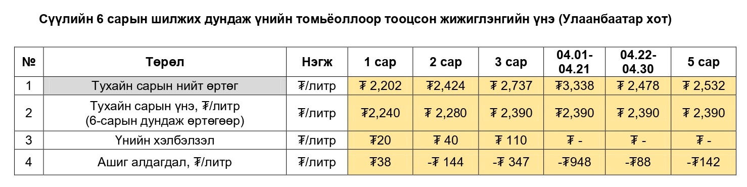 Тайлбар: Аи-92 автобензиний жижиглэнгийн үнийн өртгийн тооцоололд импортын хил үнэ (79%), татвар хураамж (10%), холбогдох зардал (12%) тус тус эзэлж байна.  Дээрх тооцооллоор Аи-92 автобензиний 05 дугаар сарын өртөг үнэ 2,532 төгрөг байна.