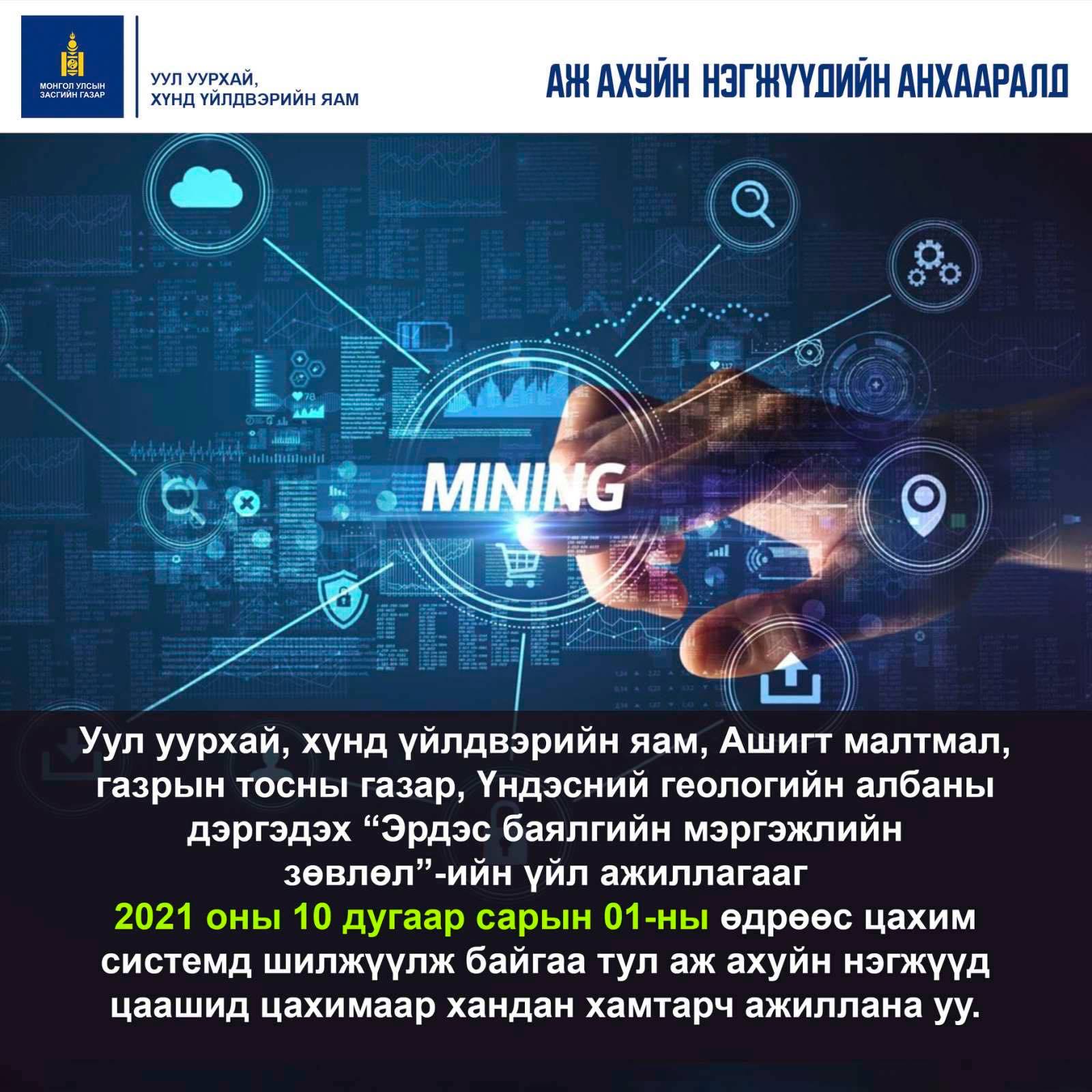 Уул уурхай, хүнд үйлдвэрийн яам, Ашигт малтмал, газрын тосны газар, Үндэсний геологийн албаны дэргэдэх “Эрдэс баялгийн мэргэжлийн зөвлөл”-ийн үйл ажиллагааг 2021 оны 10 дугаар сарын 01-ны өдрөөс цахим системд шилжүүлж байгаа тул аж ахуйн нэгжүүд цаашид цахимаар хандан хамтарч ажиллана уу.