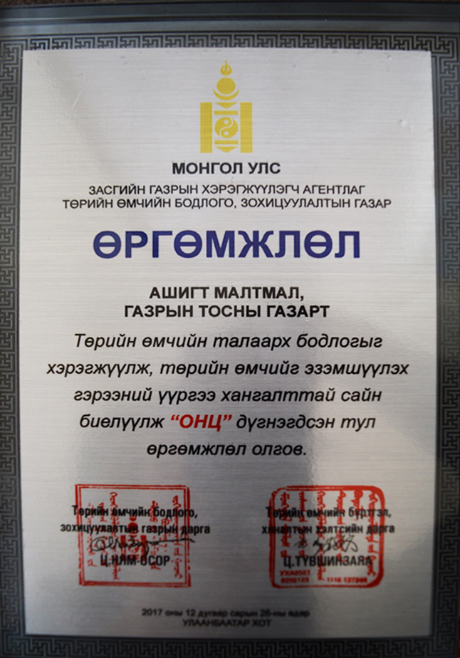ТӨБЗГ-аас АМГТГ нь төрийн өмчийн талаарх бодлогыг хэрэгжүүлж, төрийн өмчийг эзэмшүүлэх гэрээний үүргээ хангалттай сайн биелүүлж, “ОНЦ” дүгнэгдэж, өргөмжлөлөөр шагнасныг өнөөдөр гардууллаа.