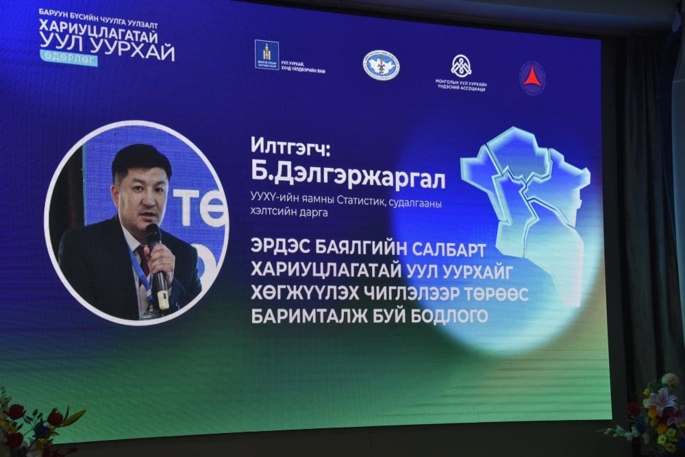 Эхний илтгэлийг "Эрдэс баялгийн салбарт хуриацлагатай уул уурхайг хөгжүүлэх чиглэлээр төрөөс баримталж буй бодлого" сэдвээр УУХҮЯ-ны Статистик, судалгааны хэлтсийн дарга Б.Дэлгэржаргал тавилаа. Тэрээр, уул уурхайн салбар өнгөрсөн онд ДНБ-ий 24 хувь, аж үйлдвэрийн салбарын 72 хувь, ГШХО-ын 83 хувь, экспортын 94 хувийг эзэлж байна. 2022 оны төсөв 18.5 их наяд байснаас 24.8 хувь буюу 4.6 их наяд төгрөг болсоныг хэллээ.