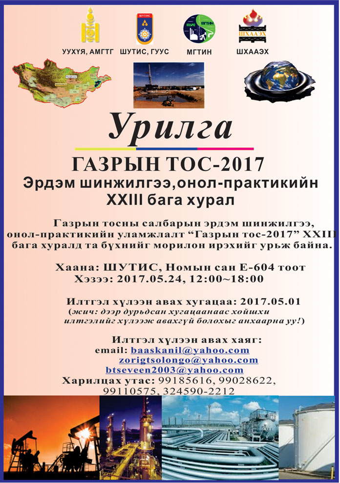 Газрын тосны салбарын эрдэм шинжилгээ, онол-практикийн бага хурал 2017 оны тавдугаар сарын 24-нд Шинжлэх ухаан, технологийн их сургууль дээр болно.