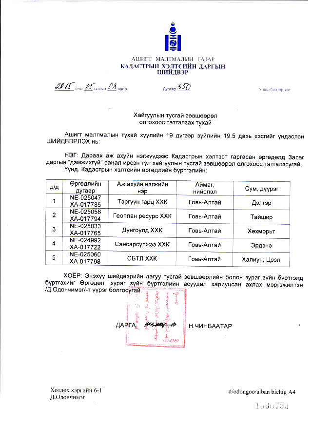 Ашигт малтмалын тухай хуулийн 19 дүгээр зүйлийн 19.5 дахь хэсгийг үндэслэн хайгуулын тусгай зөвшөөрөл олгохоос татгалзсан өргөдлүүд.