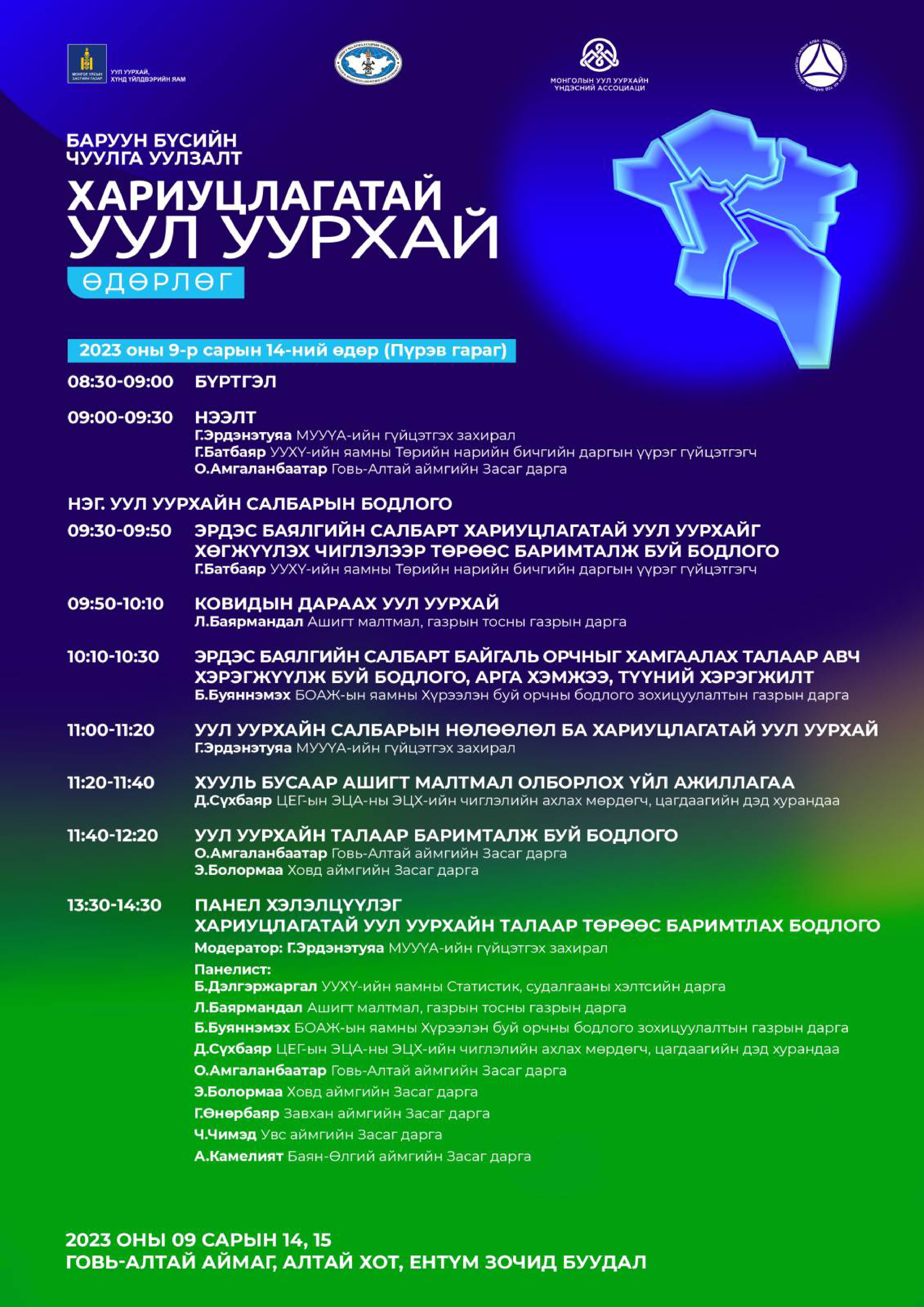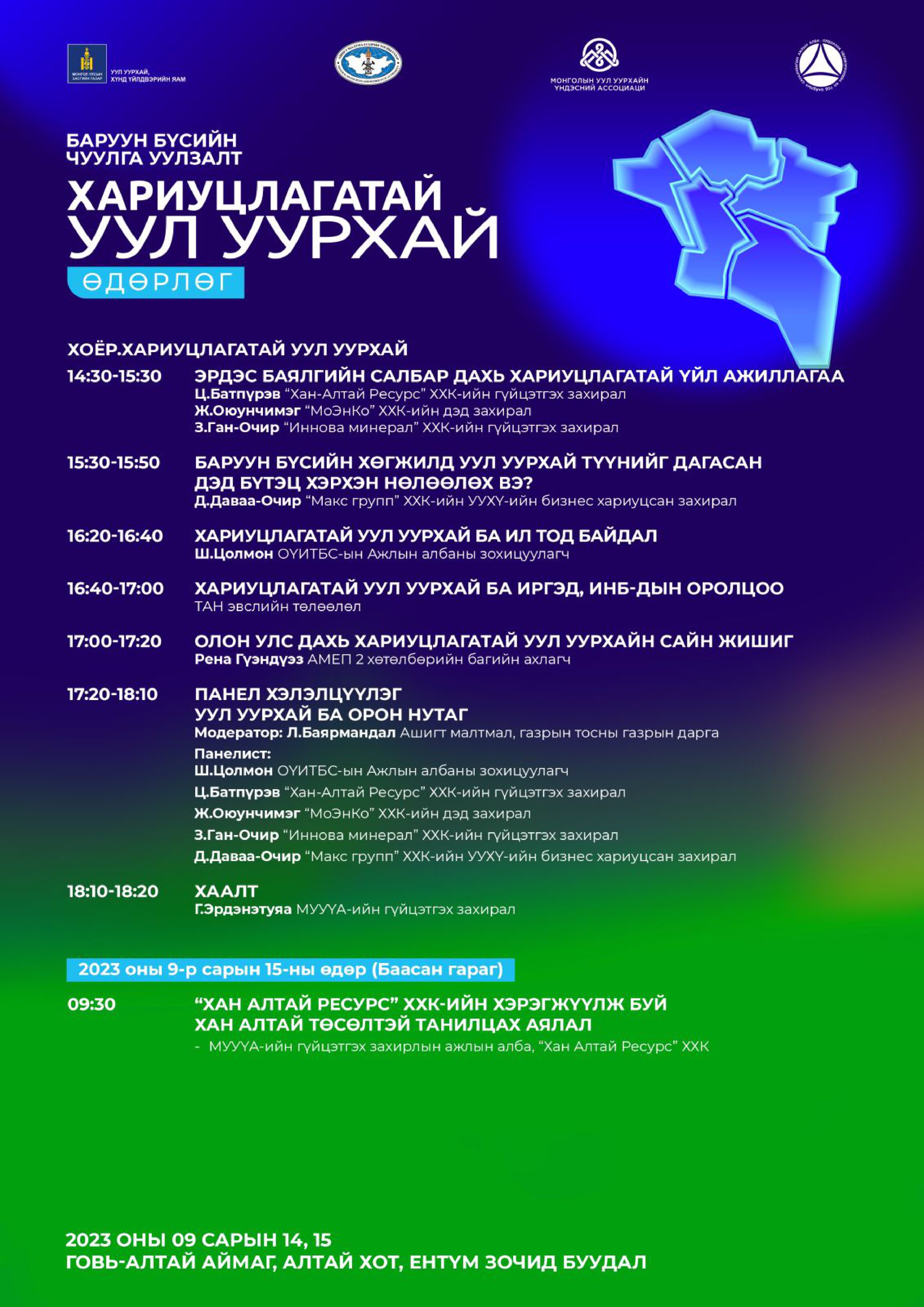 Уул уурхай, хүнд үйлдвэрийн яам, Ашигт малтмал, газрын тосны газар, Монголын уул уурхайн үндэсний ассоциаци, Олборлох үйлдвэрлэлийн ил тод байдлын санаачилгын Үндэсний зөвлөл хамтран эрдэс баялгийн салбарын ашиг тус, үр нөлөөллийг оролцогч талуудад зөв байдлаар хүргэх, хариуцлагатайгаар үйл ажиллагаа явуулж буй уул уурхайн төслүүдийн үйл ажиллагааг олон нийтэд сурталчлах замаар оролцогч талуудын хамтын ажиллагааг сайжруулах зорилгоор Баруун бүсийн “Хариуцлагатай уул уурхайн” чуулга, уулзалтыг 2023 оны 09 дүгээр сарын 14, 15-ны өдрүүдэд Говь-Алтай аймгийн Алтай хотод зохион байгуулах гэж байгаа тул та бүхэн идэвхитэй оролцоно уу.