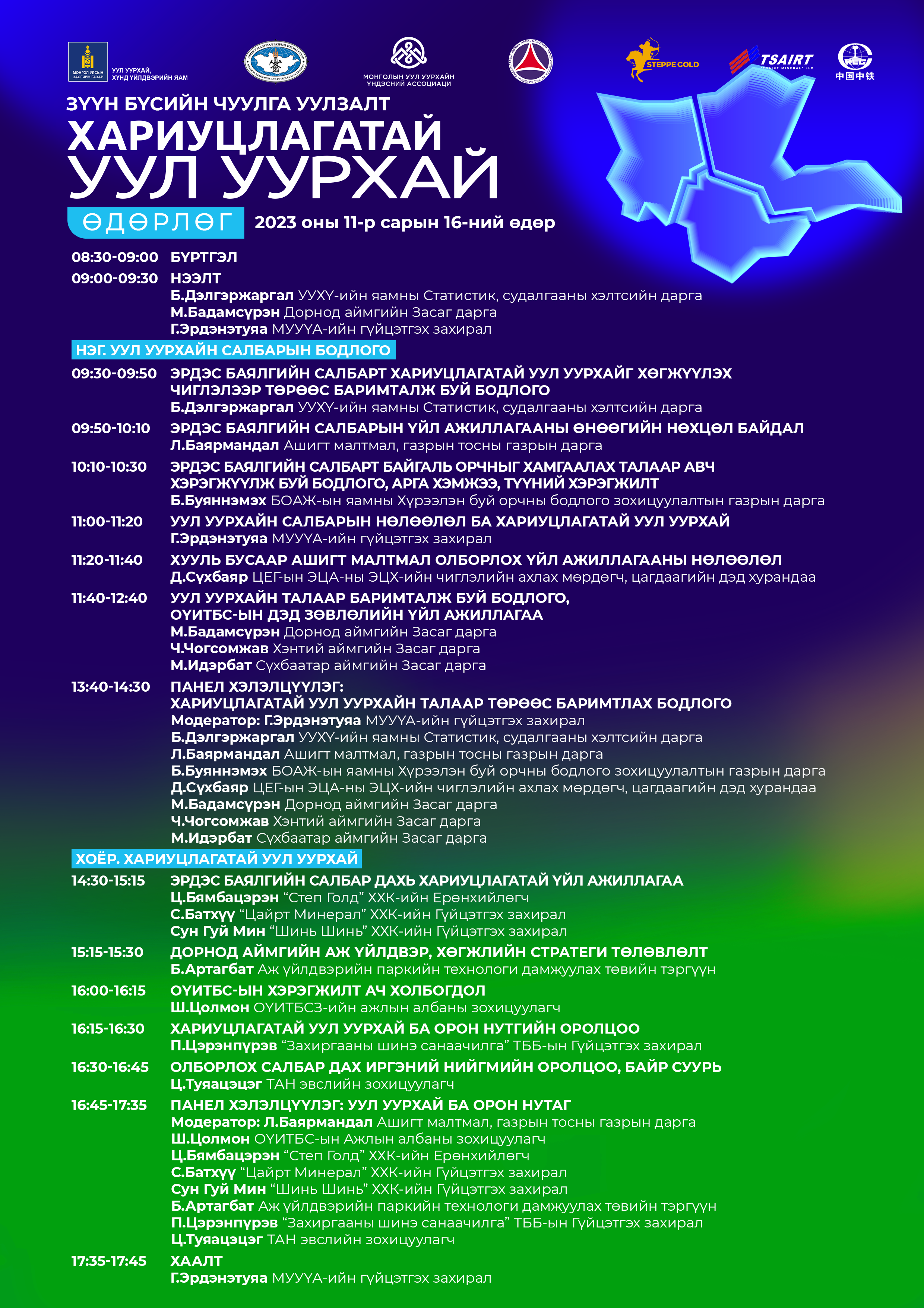 Уул уурхай, хүнд үйлдвэрийн яам, Ашигт малтмал, газрын тосны газар, Монголын уул уурхайн үндэсний ассоциаци, Олборлох үйлдвэрлэлийн ил тод байдлын санаачилгын Үндэсний зөвлөл хамтран эрдэс баялгийн салбарын ашиг тус, үр нөлөөллийг оролцогч талуудад зөв байдлаар хүргэх, хариуцлагатайгаар үйл ажиллагаа явуулж буй уул уурхайн төслүүдийн үйл ажиллагааг олон нийтэд сурталчлах замаар оролцогч талуудын хамтын ажиллагааг сайжруулах зорилгоор Зүүн бүсийн “Хариуцлагатай уул уурхайн” чуулга уулзалтыг 2023 оны 11 дүгээр сарын 16, 17-ны өдрүүдэд Дорнод аймгийн Чойбалсан хотод зохион байгуулах гэж байгаа тул та бүхэн идэвхтэй оролцоно уу.
