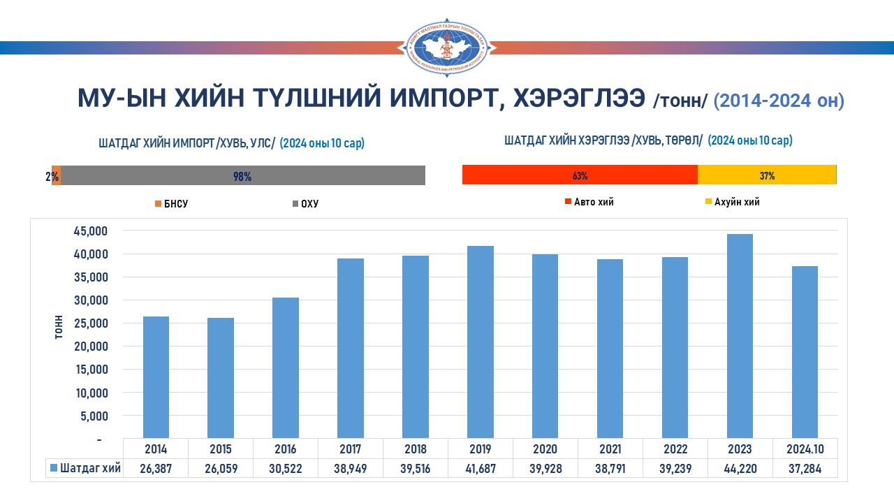 Монгол улсын хэмжээнд 2024 оны эхний 10 сарын байдлаар 37,284 тонн шатдаг хий импортолсон бөгөөд өмнөх оны мөн үетэй харьцуулахад хоёр хувиар өссөн үзүүлэлттэй байна. Шатдаг хийн хэрэглээгээр авч үзвэл 63 хувийг авто хий, 37 хувийг ахуйн хий эзэлж байна.
