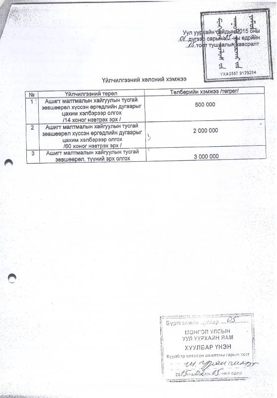 Ашигт малтмалын хайгуулын тусгай зөвшөөрөл хүссэн өргөдлийн дугаарыг цахим хэлбэрээр олгох, ашигт малтмалын хайгуулын тусгай зөвшөөрөл, түүний эрх олгох үйлчилгээний хөлсний хэмжээг Уур уурхайн сайдын 2015 оны 01 дүгээр сарын 23 өдрийн 15 тушаал.