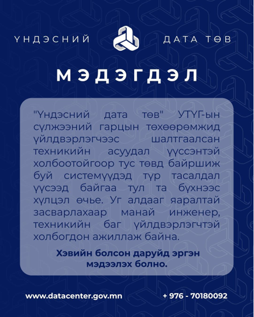 2025 оны 04 дүгээр сарын 01-ний өдөр “Үндэсний дата төв” УТҮГ-т техникийн саатал гарсны улмаас тус газар байрших системүүдийн ажиллагаа алдагдсан.