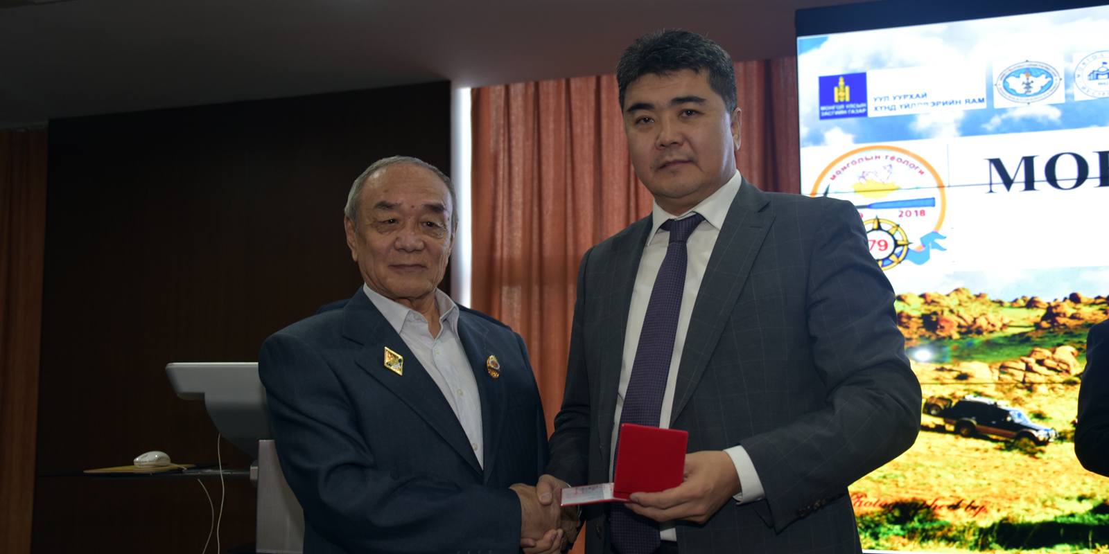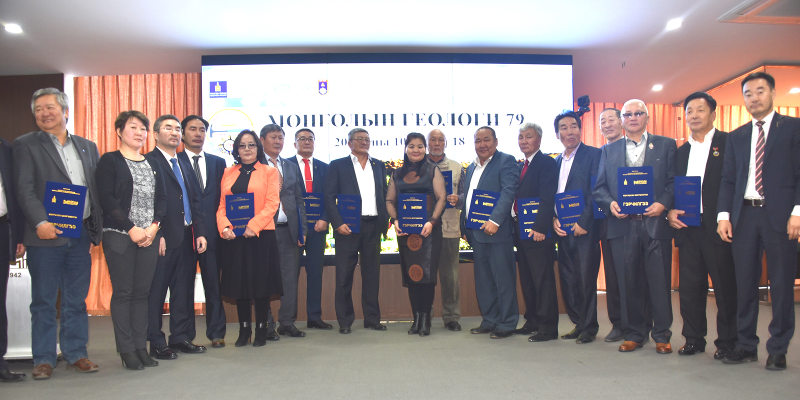 Монгол Улсад геологийн салбар үүсч хөгжсөний 79 жилийн ойн баярын хуралд Ашигт малтмал газрын тосны газрын дарга Х.Хэрлэн болон салбарын эрдэмтэд үе үеийн геологичдын төлөөлөл оролцож байна.