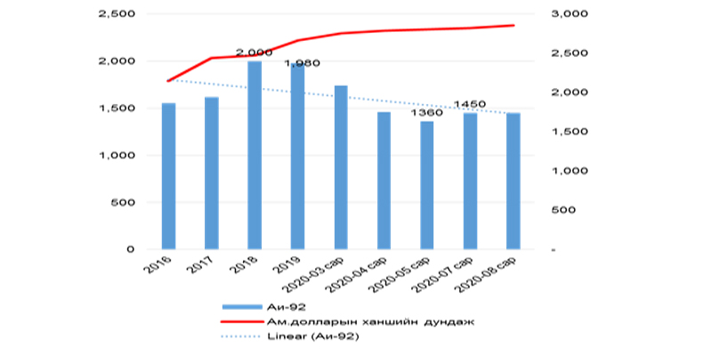 - Үүний үр дүнд Монгол улсын шатахууны нийт жижиглэнгийн худалдааны 60 орчим хувийг эзэлдэг АИ-92 автобензиний үнэ 1400-1450 төгрөгт тогтвортой хадгалагдаж байгаа бөгөөд энэ нь өргөн хэрэглээний гол нэрийн бараа, бүтээгдэхүүний үнэ өсөхгүй байхад тодорхой хэмжээгээр нөлөөлж байна.