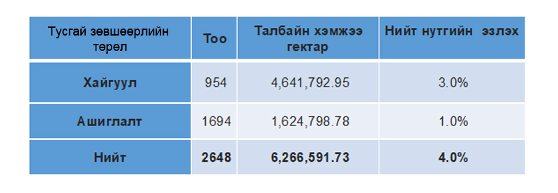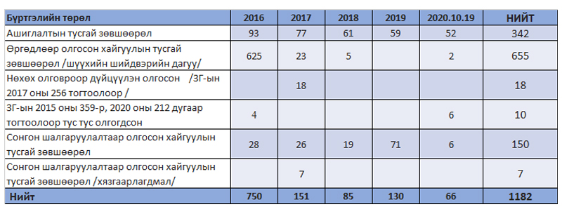 2016 оны байдлаар ашигт малтмалын нийт 3580 тусгай зөвшөөрөл хүчин төгөлдөр байснаас 2020 онд нийт 2648 тусгай зөвшөөрөл болж буурсан бөгөөд 2016-2020 онуудад Ашигт малтмалын тухай хууль болон холбогдох хууль тогтоомжийг зөрчин үйл ажиллагаа явуулж байсан аж ахуйн нэгжийн 932 ашигт малтмалын тусгай зөвшөөрлийг тухай бүр нь цуцлан холбогдох шийдвэрийг гаргаж нийт 185,651.58 гектар талбайг чөлөөлж төрийн мэдэлд буцаан аваад байна.