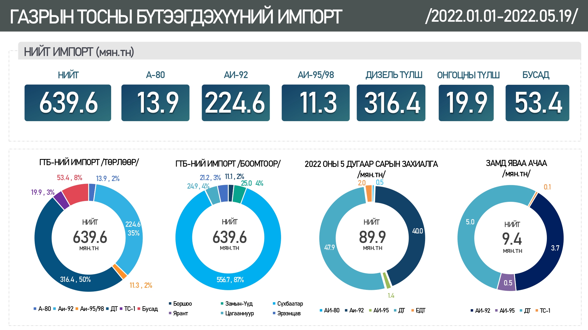 Газрын тосны бүтээгдэхүүний импортын хувьд 2022 оны 01 дүгээр сараас 05 дугаар сарын 19-ний өдөр хүртэл хугацаанд нийт 639.6 мян.тн газрын тосны бүтээгдэхүүн импортолсон бөгөөд үүнээс: