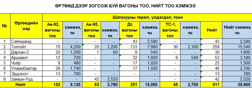 Нийлүүлэгч талаас буюу ОХУ-аас 9, 10 дугаар саруудын захиалгыг бүрэн биелүүлэх хүрээнд шатахууны ачилт, тээвэрлэлтийн хэмжээг 10 дугаар сарын дунд үеэс нэмэгдүүлж, Сүхбаатар боомтоор сүүлийн дөрөв хоногт 214 вагон буюу 12840 тонн АИ-92 бензин, 278 вагон буюу 16680 тонн дизель түлш тус тус ирж ирсэн. Энэ нь АИ-92 бензиний хувьд 8 хоног, дизель түлшний 6-7 хоногийн ердийн хэрэглээтэй тэнцэх нөөц юм.