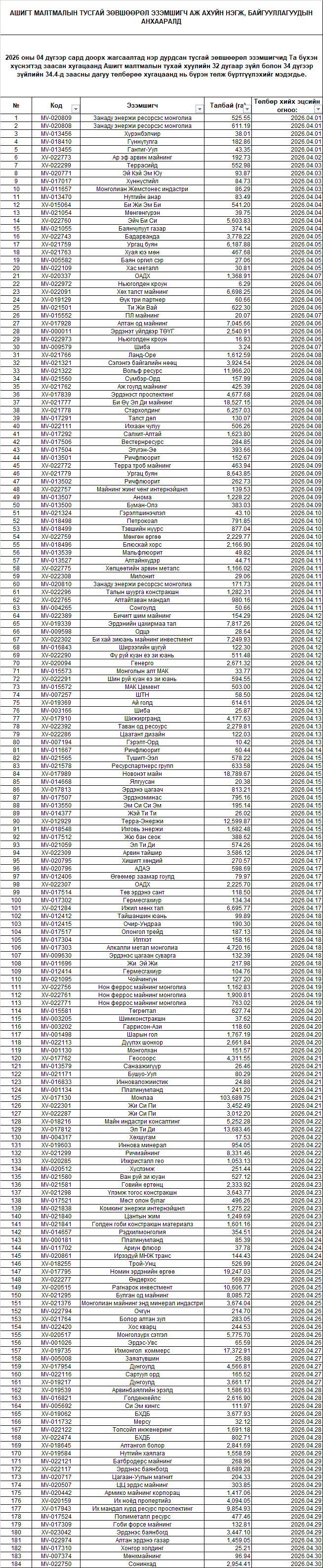 ● АШИГТ МАЛТМАЛ, ГАЗРЫН ТОСНЫ ГАЗРЫН СТАТИСТИК МЭДЭЭ ● Ашигт малтмалын ашиглалтын болон хайгуулын хүчин төгөлдөр тусгай зөвшөөрлийн тоо 2,831 (2026.III.31) ● Хүчин төгөлдөр ашигт малтмалын тусгай зөвшөөрөл бүхий талбай 7.259 сая га (2026.III.31) ● Нийт нутаг дэвсгэрт ашигт малтмалын тусгай зөвшөөрөл бүхий талбайн эзлэх хувь 4.5% (2026.III.31) ● Хувийн хөрөнгөөр геологи, хайгуулын ажилд 2025 оны 01 дүгээр сард зарцуулсан зардал 40.5 тэрбум төгрөг (2026.III.31) ● Алтны дэлхийн зах зээлийн дундаж үнэ 4,868.8 ам.доллар/унци (2026.III) ● Зэсийн дэлхийн зах зээлийн дундаж үнэ 12,498.4 ам.доллар/тонн (2026.III) ● Эрчим хүчний нүүрсний дэлхийн зах зээлийн дундаж үнэ 59.29 ам.доллар/тонн (2026.III) ● Коксжих нүүрсний дэлхийн зах зээлийн дундаж үнэ 62.08 ам.доллар/тонн (2026. III) ● Нүүрсний олборлолт 8,898.5 мянган тонн (2026. III) ● Нүүрсний борлуулалт 8,695.1 мянган тонн (2026. III) ● Нүүрсний экспорт 7,820.7 мянган тонн (2026. III) ● Газрын тосны олборлолт 301,787 баррель (2026. III) ● Газрын тосны экспорт 358,416 баррель (2026.III) ● Газрын тосны бүтээгдэхүүний импорт 288,191 мянган тонн (2026.III) ● АМГТГ-ын улсын төсөвт төвлөрүүлсэн орлого 83.95 тэрбум төгрөг (2026.III).