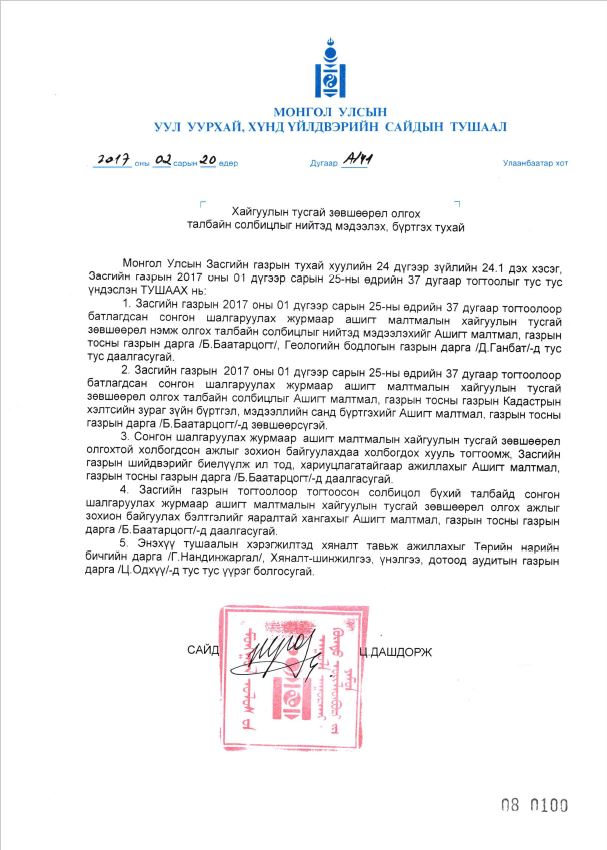 Монгол Улсын Засгийн газрын 2017 оны 1-р сарын 25-ны өдрийн 37 тоот тогтоолоор батлагдсан сонгон шалгаруулах журмаар ашигт малтмалын хайгуулын тусгай зөвшөөрөл олгох талбайн солбицлыг нийтэд мэдээлж байна.