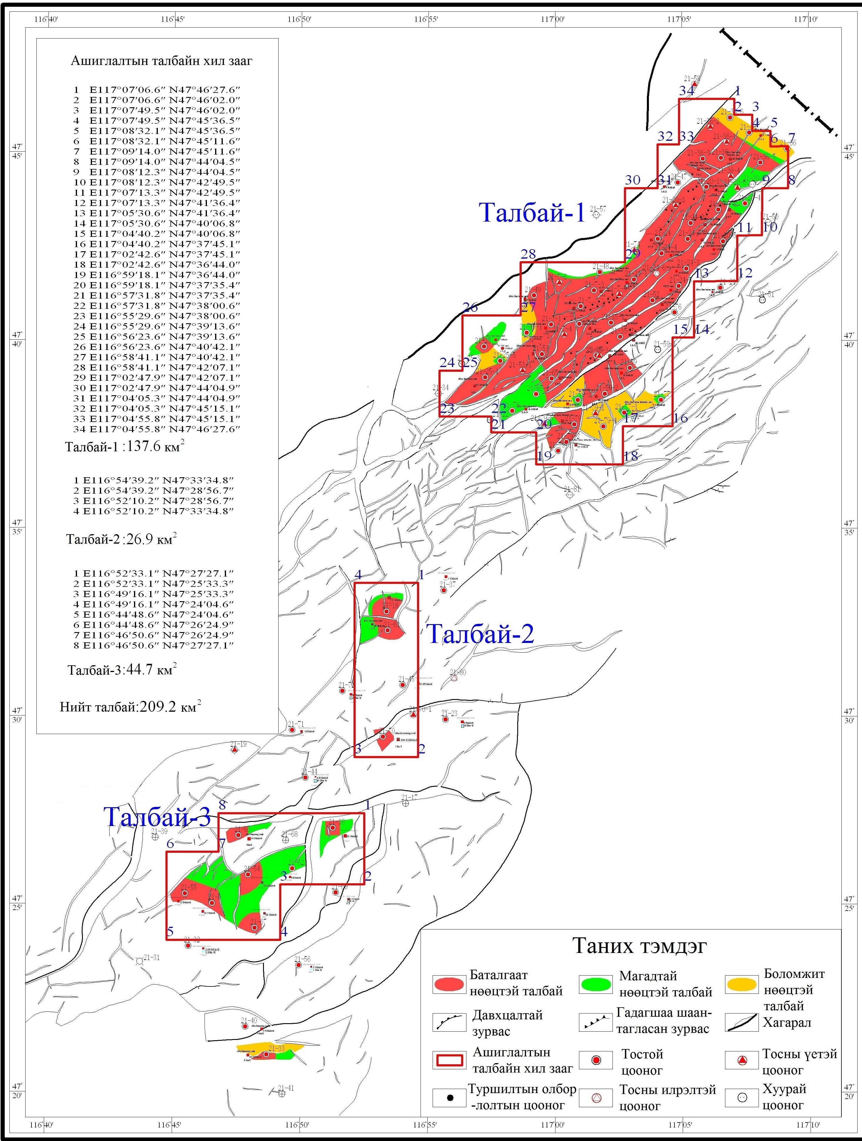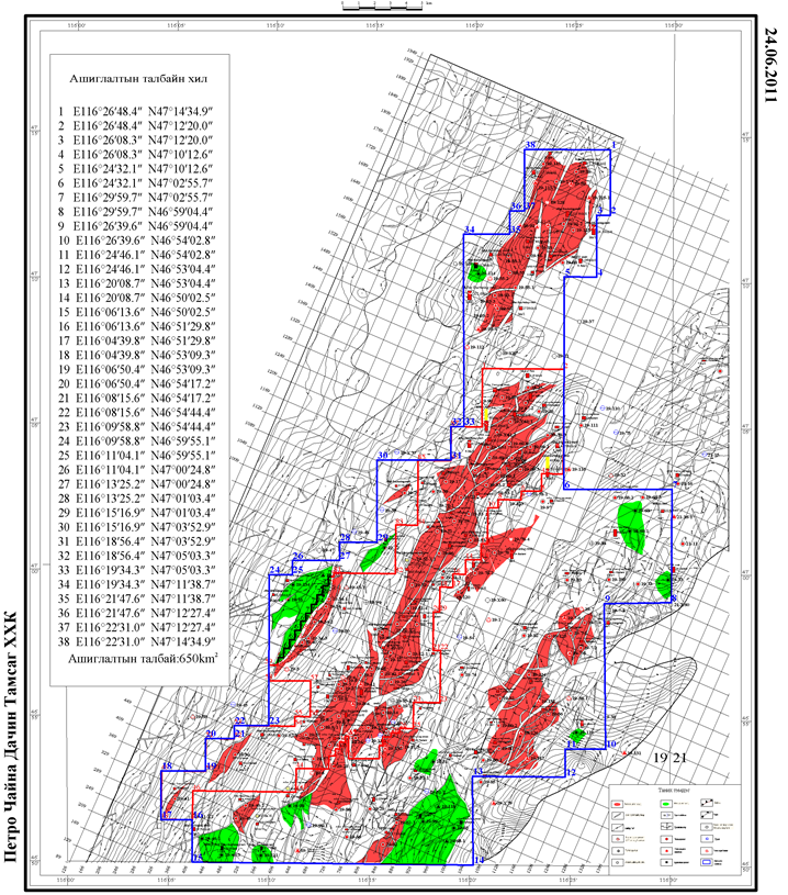 Монгол Улсын хэмжээнд газрын тосны хэтийн төлөв бүхий 34 талбай ялгаснаас 2025 оны байдлаар Засгийн газрын баталсан Бүтээгдэхүүн хуваах гэрээний дагуу 4 талбайд газрын тосны ашиглалтын үйл ажиллагаа явагдаж байна. Үүнд Тосон-Уул XIX, Тамсаг XXI талбайд Петрочайна Дачин Тамсаг ХХК, 1997 оны БХГ-т талбайд Доншен Газрын тос (Монгол) ХХК, Матад XX талбайд Петроматад ХХК нь тус тус газрын тосны олборлолт, ашиглалтын үйл ажиллагааг явуулж байна. /Зураг-1/
