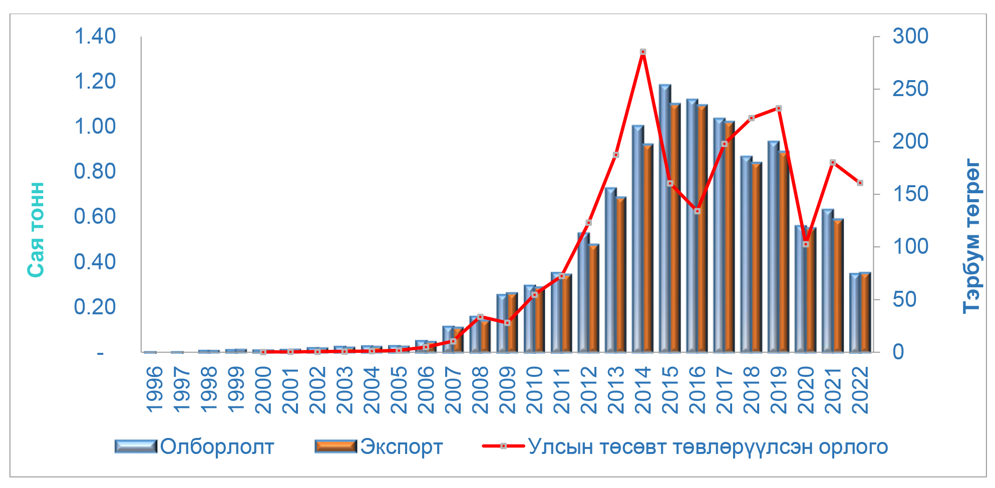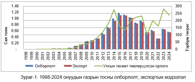 Монгол Улсын хэмжээнд 1998-2025 оны хооронд нийт 11.75 сая тонн газрын тос олборлосон ба 11.267 сая.тонн газрын тос БНХАУ-руу экспортлож, борлуулалтын орлогоос 2.79 их наяд төгрөгийг Улсын төсөвт төвлөрүүлээд байна. 2025 онд нийт 4.24 сая баррель буюу 579 мянган тонн газрын тос олборлон экспортлох төлөвлөгөөтэй ба 2025.06.11-ний өдрийн байдлаар 1.7 сая баррель буюу 231.3 мянган тонн газрын тос олборлож, экспортолсон. Төлөвлөгөөний гүйцэтгэл 40.12 хувьтай байна.