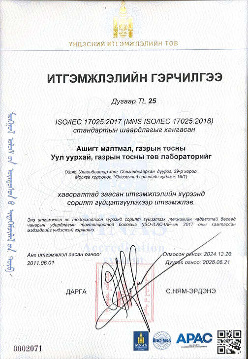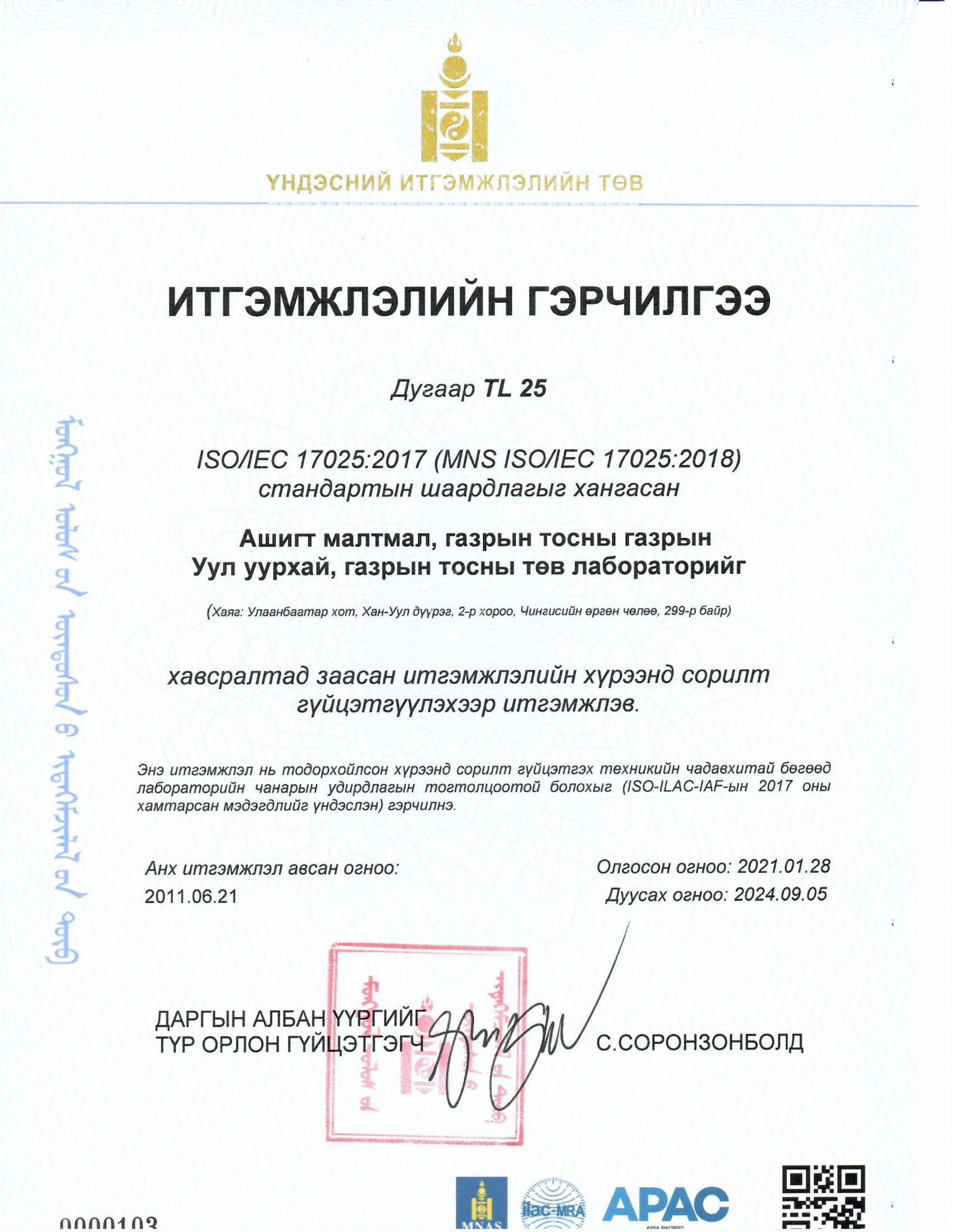 Уул уурхай, газрын тосны төв лаборатори нь Үндэсний итгэмжлэлийн төвийн даргын 2024 оны 12 дугаар сарын 26-ны өдрийн А/383 тоот тушаалаар MNS ISO/IEC 17025:2018 “Сорилтын болон шалгалт тохируулгын лабораторийн чадавхад тавих ерөнхий шаардлага”-ыг ханган 6 дахь удаа итгэмжлэлийн хугацааг сунгуулан, 4 жилийн хугацаатай итгэмжлэгдсэн.